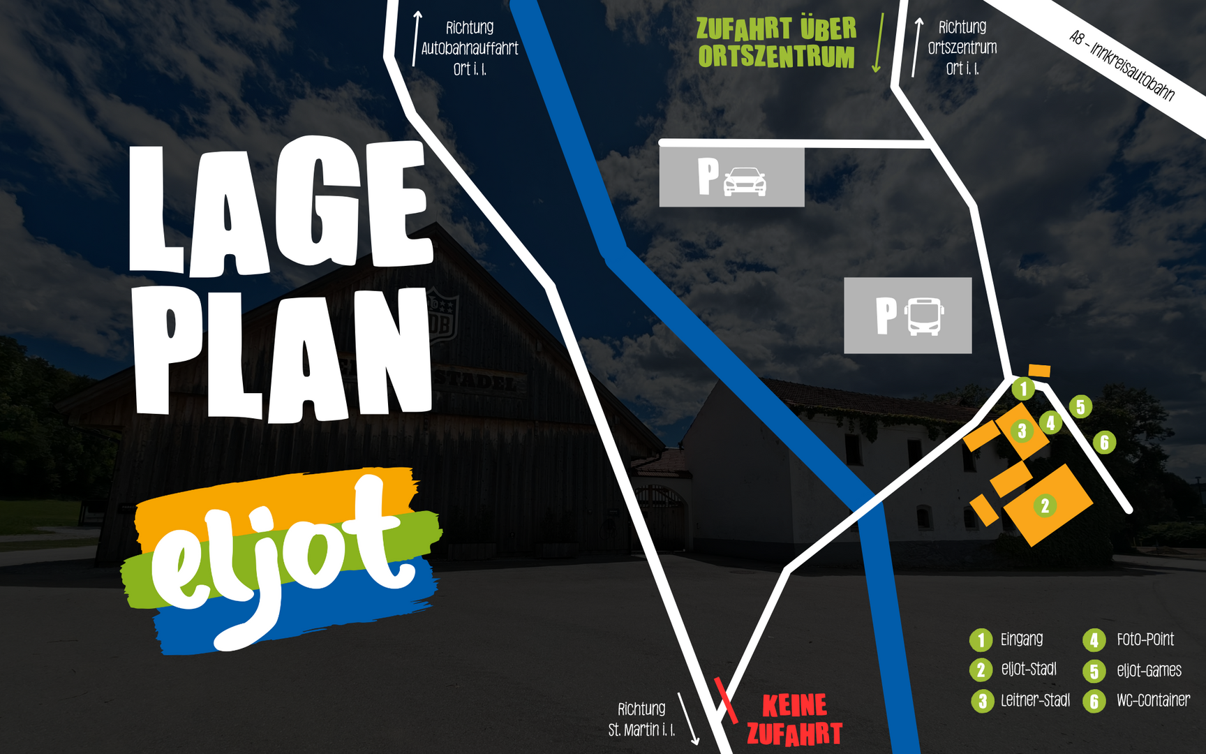 Wir empfehlen euch mit Bussen zum eljot-Festival anzureisen. So könnt ihr alle den Festival-Tag nach vollen Zügen genießen! Nähere Informationen zum Busparkplatz folgen bald.